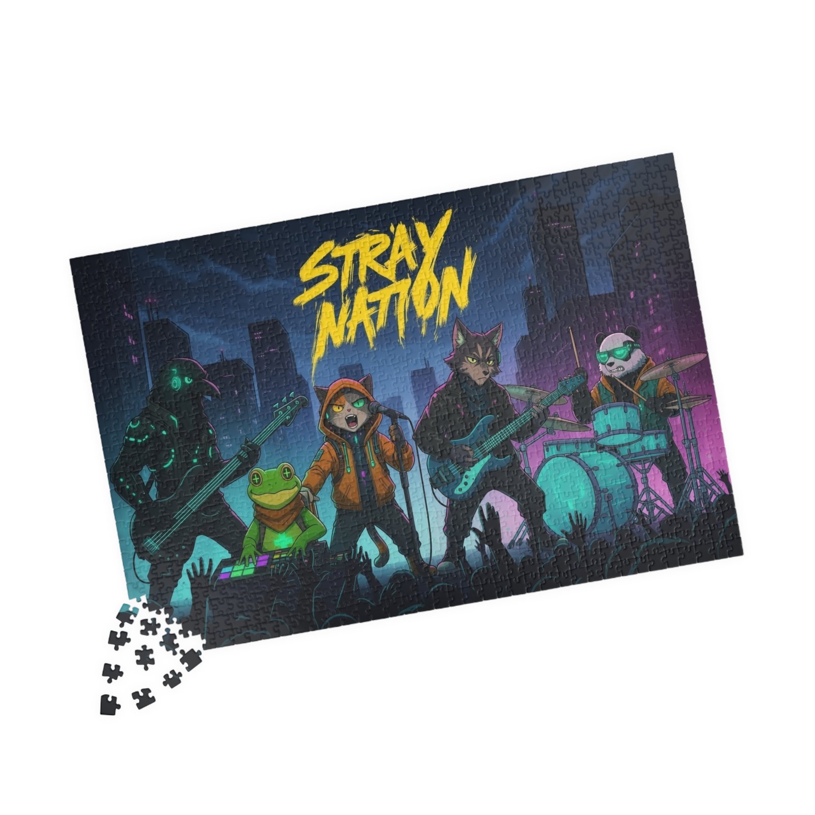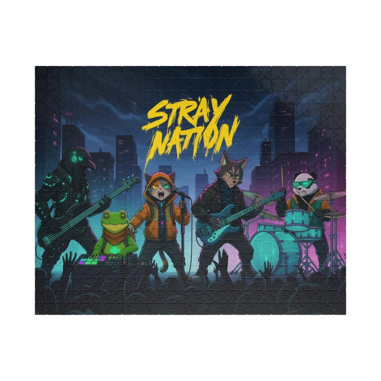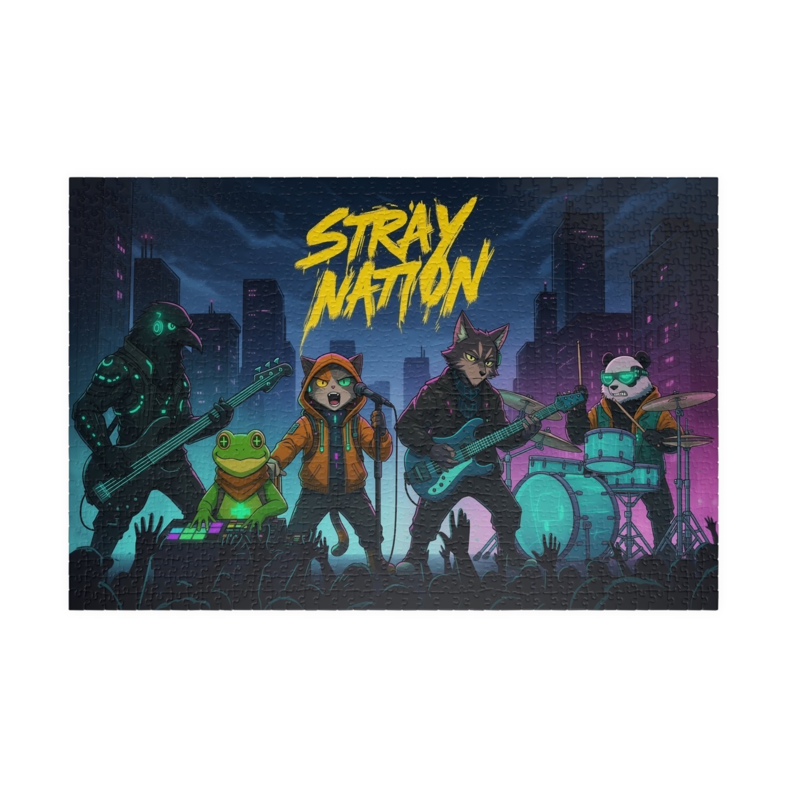 Gather around the table and dive into a neon-soaked night of music and mischief. This puzzle brings a gritty, electric concert scene to life — moonlit skyscrapers, a charge of crowd energy, and an animated band of characters mid‑riff. Piece by piece you’ll feel the tempo pick up as bright blues, magentas, and teal highlights snap into place. The glossy laminated surface amplifies the colors, while sturdy chipboard pieces give a satisfying click when they lock together. Packaged in a printed paper box, it arrives ready to gift or stash on a shelf until the next game night. Whether you’re easing into a quiet evening or building something loud with friends, this puzzle turns time together into a shared encore.