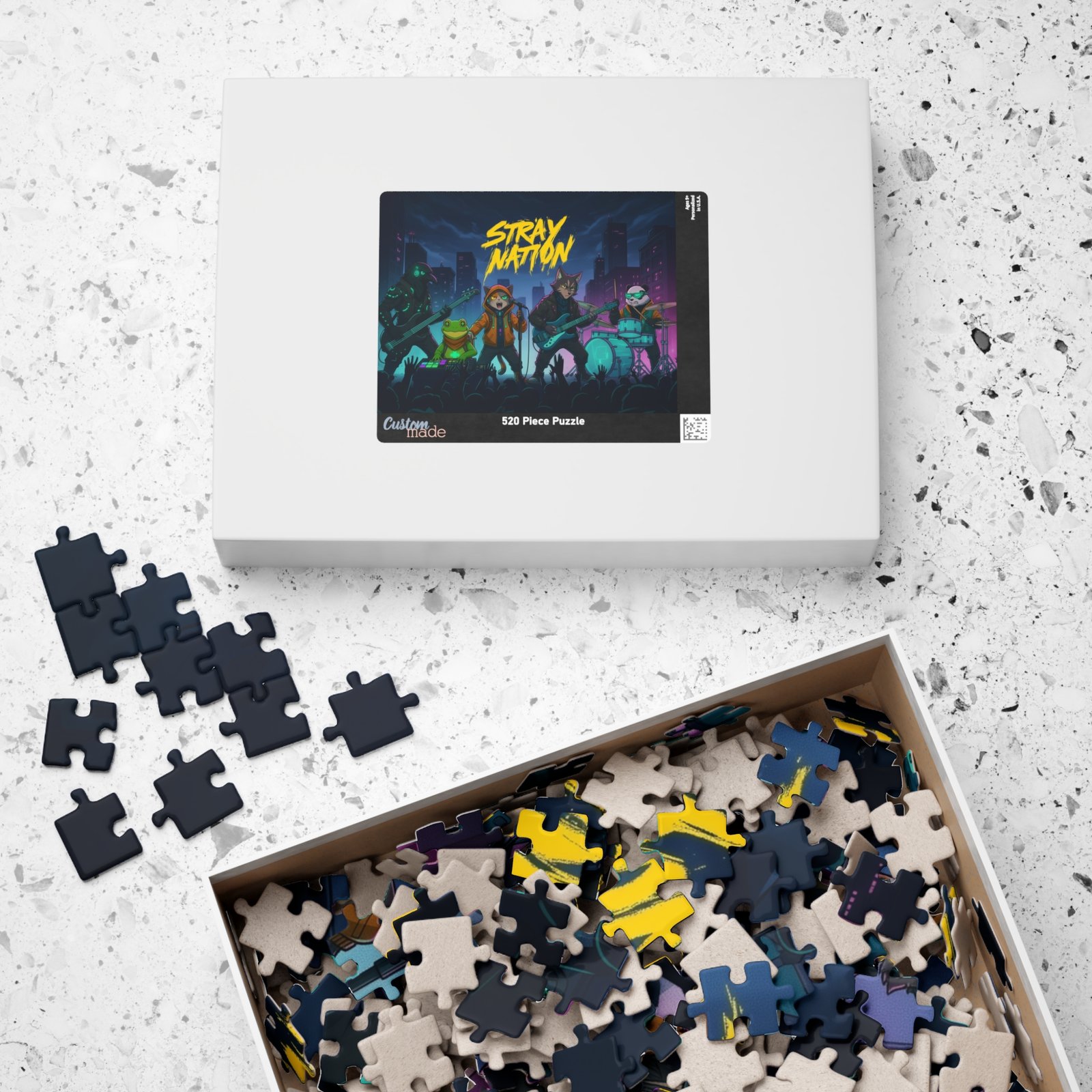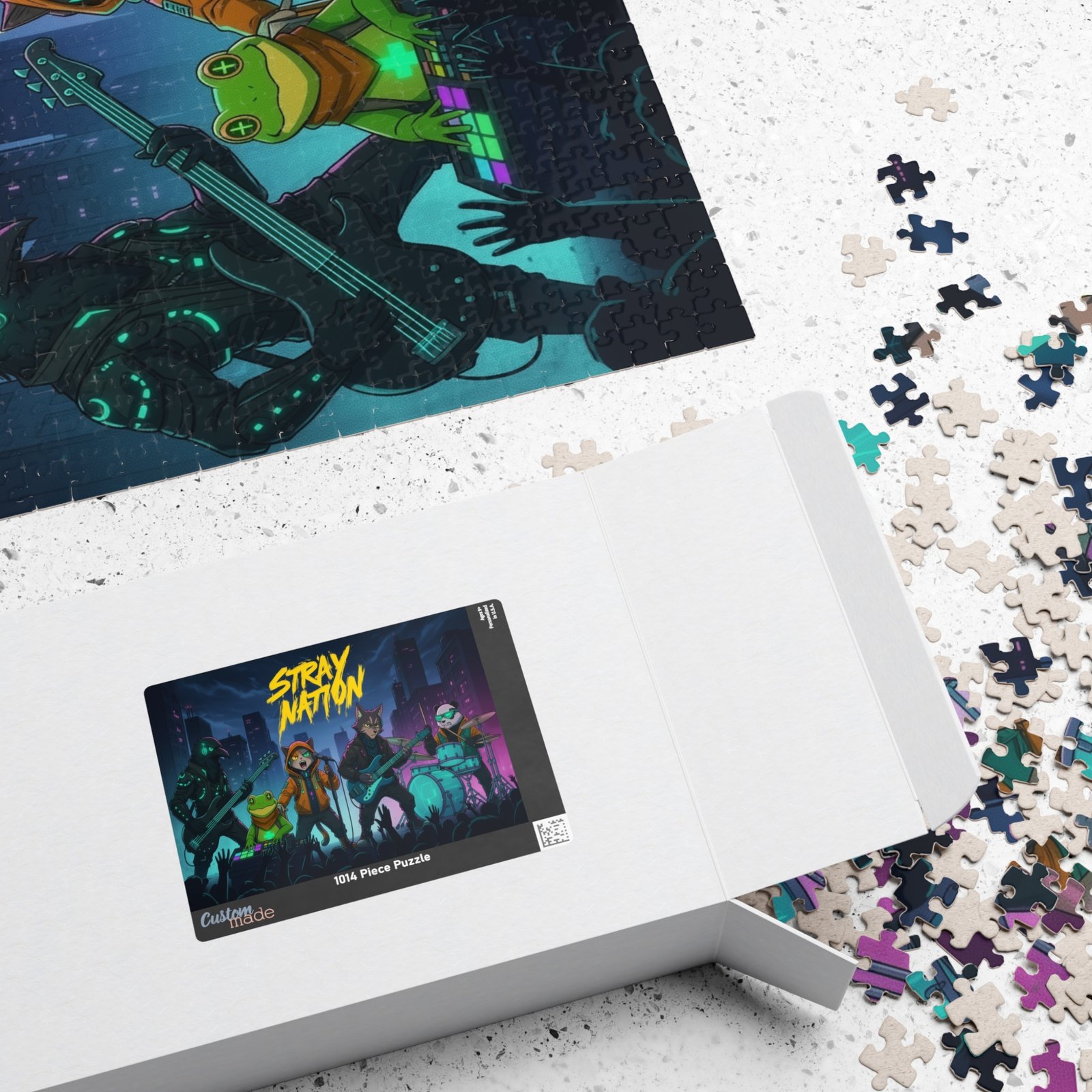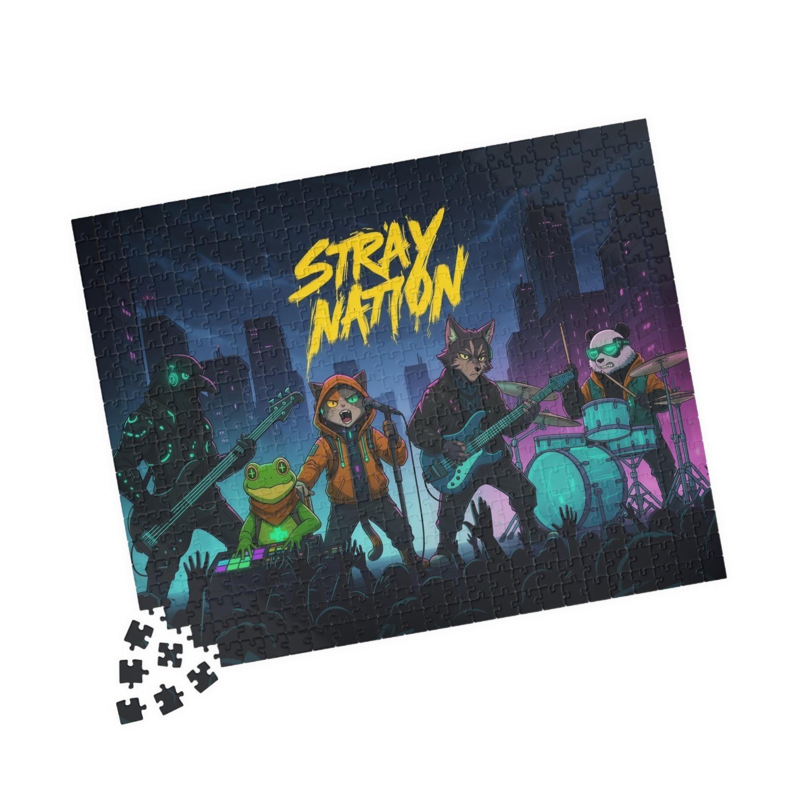 Gather around the table and dive into a neon-soaked night of music and mischief. This puzzle brings a gritty, electric concert scene to life — moonlit skyscrapers, a charge of crowd energy, and an animated band of characters mid‑riff. Piece by piece you’ll feel the tempo pick up as bright blues, magentas, and teal highlights snap into place. The glossy laminated surface amplifies the colors, while sturdy chipboard pieces give a satisfying click when they lock together. Packaged in a printed paper box, it arrives ready to gift or stash on a shelf until the next game night. Whether you’re easing into a quiet evening or building something loud with friends, this puzzle turns time together into a shared encore.